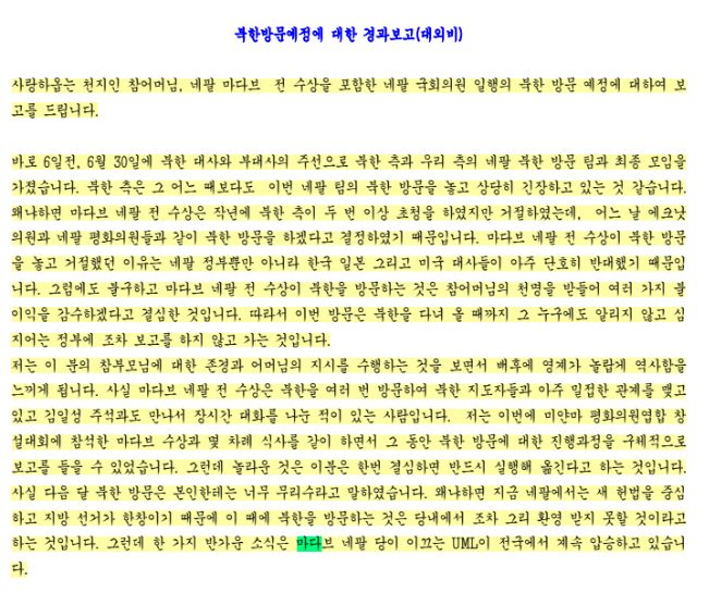 가장 주목할 점은 대표적 반공 단체인 통일교가 네팔의 공산당 지도자들을 매개로 북한과 접촉을 시도했다는 것이다. 문건은 “마다브 쿠마르 네팔 전 총리는 참부모님을 하나님처럼 여기는 사람”이라며 그와 밀접한 관계를 맺고 있다고 강조했다.