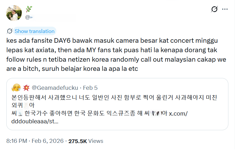 또 다른 한국 X 이용자들은 말레이시아 콘서트장에서 벌어진 DSRL 카메라 사용 문제를 한국 팬들이 이미 사과했으나 영어를 자유롭게 쓰는 동남아시아 X 이용자들이 논란을 확산시키고 한국 비난을 계속하면서 갈등이 커졌다고 말한다.