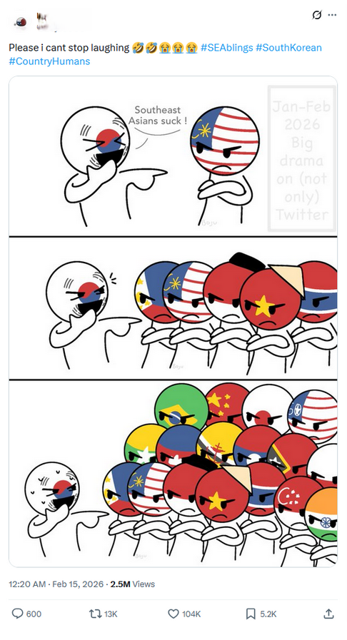 이 과정에서 한국 네티즌 대응이 동남아 전체를 싸잡아 비난하는 듯한 양상을 띠자 타이, 베트남, 필리핀 네티즌까지 합류하며 사이버 다툼은 '한국 vs 동남아' 구도로 번졌다. 일부 한국 네티즌은 X에 오랑우탄 사진을 올려 놓고 ‘인도네시아 사람들의 가족사진’이라며 모멸적인 표현까지 동원했다.